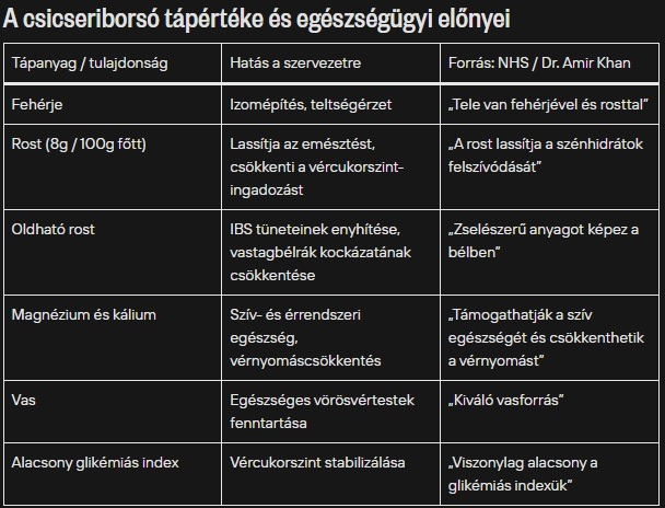Dr. Khan hozzátette, a csicseriborsó kiváló magnézium- és káliumforrás is, amelyek „támogathatják a szív egészségét és csökkenthetik a vérnyomást”. Emellett jelentős mennyiségű vasat tartalmaz, ami elengedhetetlen az egészséges vörösvértestek fenntartásához. Saját kedvenc fogyasztási módját is megosztotta: „Egyél humuszként, add a salátához, vagy csináld azt, amit én – egyenesen a konzervből, egy kis chilipehellyel. Isteni finom.”