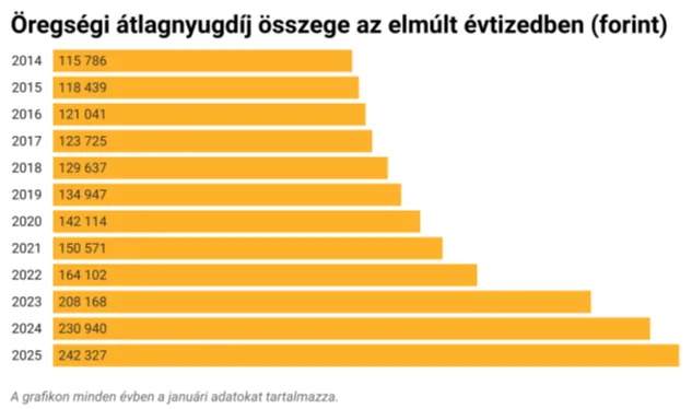 Hosszabb távon ugyan látványosabb a változás: 2014 és 2025 között az átlagnyugdíj több mint duplájára nőtt. Míg 2014-ben 115 786 forint volt az átlagos ellátás, addig 2025-re már meghaladta a 250 ezer forintot. Ez azonban nagyrészt csak nominális növekedés. A pénz vásárlóereje közben jelentősen csökkent, így a mai 250 ezer forint reálértéken nem feltétlenül ér többet, mint tíz éve a 115 ezer.